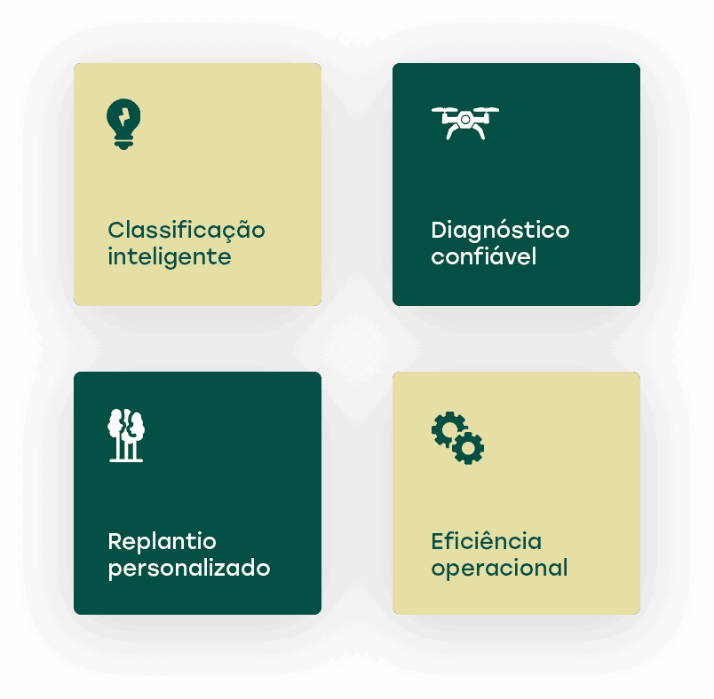 Por meio de um fluxo integrado de tecnologia e inteligência de dados, o sistema acompanha cada muda desde a captura das imagens até a geração de recomendações práticas para o replantio.